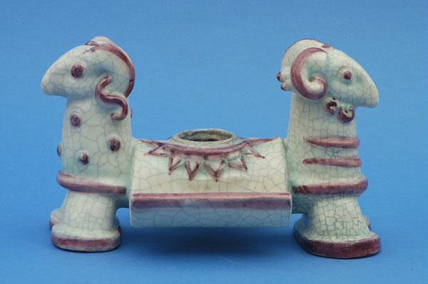 Form: Tintenfaß in Fabeltierform. In der Mitte runder Tintenbehälter mit beidseitiger geschwungender Ablage für Stifte. An beiden Stirnseiten Fabeltieroberkörper mit Vorderfüßen. Bemalung: Auf hellem Fond farbliche Akzente - Details wie augen und Nase, Füße - in Mangan und Grün. Craquelierte Mattglasur. 1926 wurde das Sortiment um die Warengattungen "Aschenbecher" und "Schreibzeug mit Löscher" erweitert. Die Entwürfe stammen von Karl Taggeselle und Fritz Theilmann. Während Taggeselle funktionale Formlösungen bevorzugte, gestaltete Theilmann die Aschenbecher in Form von Tieren.