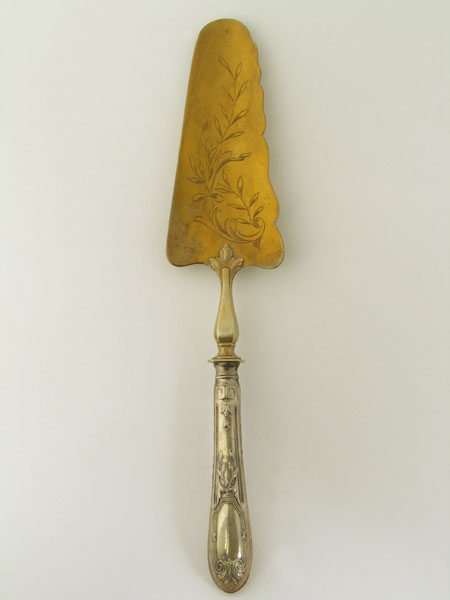 Der silberne Tortenheber ist im Bereich des Schiebers vergoldet. Der gerundete Hohlgriff ist streng geometrisch mit Ornamenten und Blattgirlanden gegliedert und besteht aus zwei identischen Teilen, die an der Seite zusammengelötet sind. Der Hals des Schiebers ist in den Griff gesteckt, verbreitert sich zum Schieber hin zunächst, verjüngt sich dann wieder, um letztendlich in einem dreizackigen Blatt den Schieber zu halten. Der Schieber ist an der linken Seite gerade (mit Schneidefunktion) und an der rechten Seite von dekorativer geschwungener Form. Ein Rankenornament schmückt ihn auf der Oberseite, unten ist er schlicht.